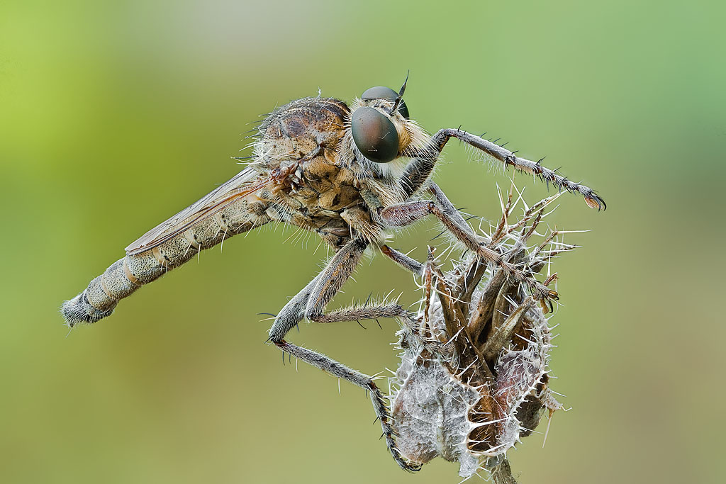 Andrenosoma albopilosum Villeneuve, 1911 (cf.) - Asilidae (in deposizione)