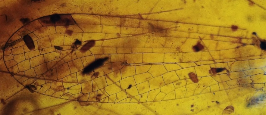 Ala di Libellula fossile nell'ambra birmana di 99 M.A. (Cretaceo).