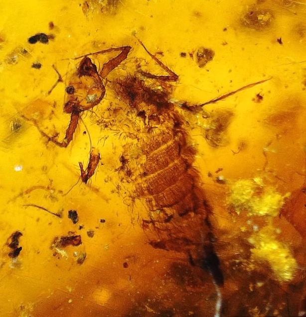 Psocottero con vicino una zampa di blatta nell'ambra cretacea del Myanmar