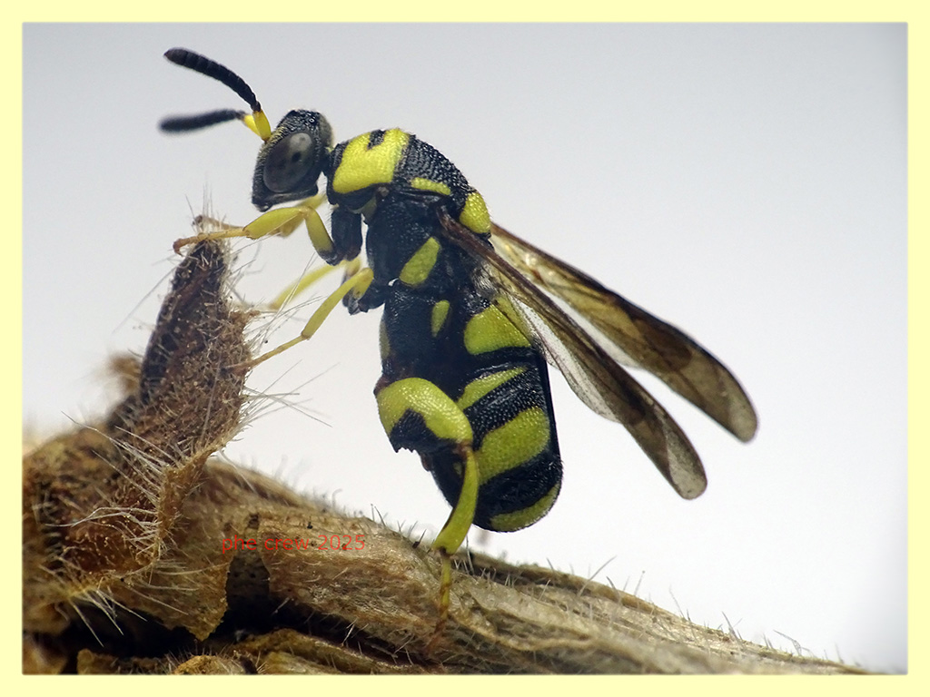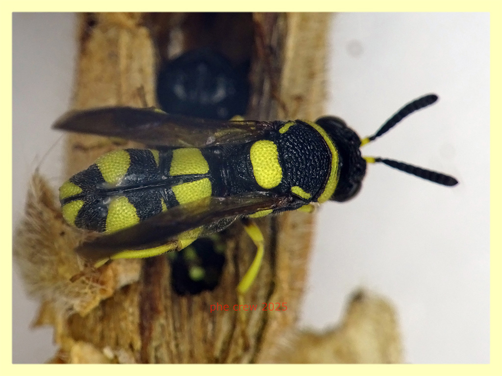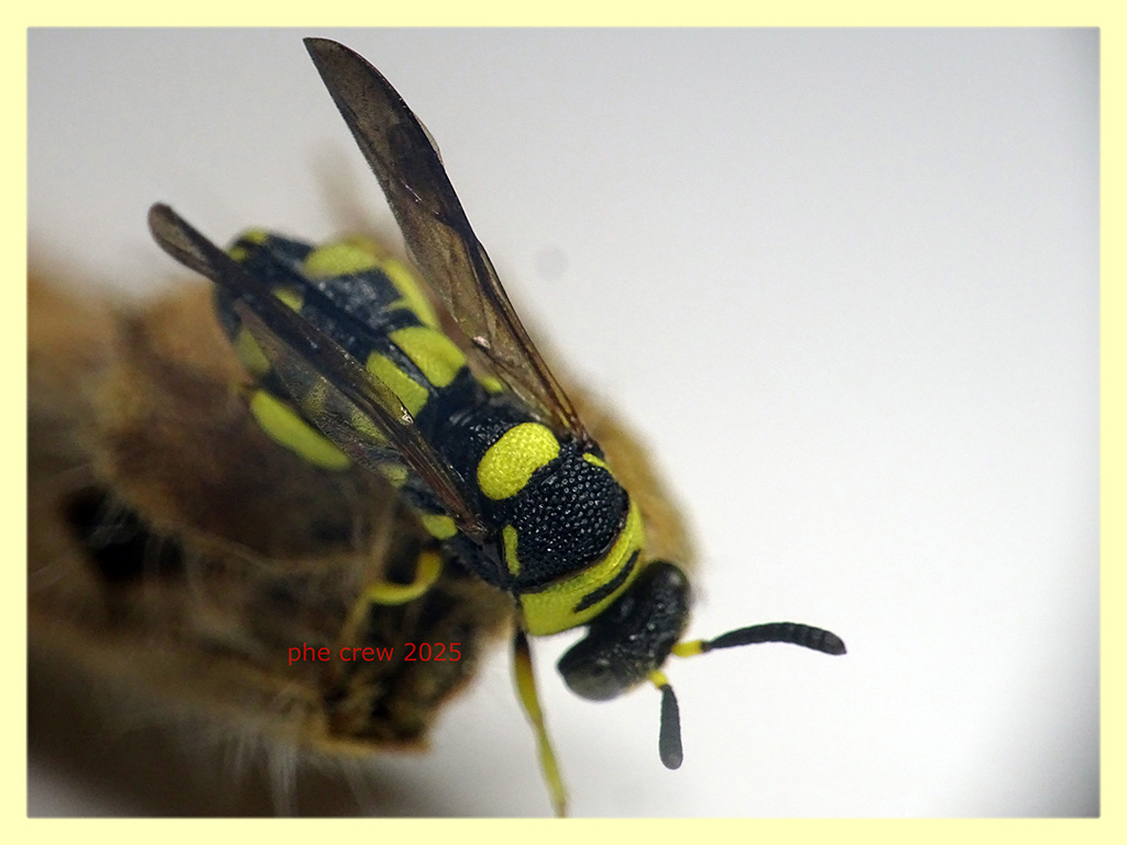 ....mi pare Leucospis dorsigera, ma in confronto a tutti gli esemplari del forum vedo la tacca nera su pronoto molto piu' corta......e' lei ?...misura tra 8 e 9 mm., se me la confermate la libero che sono 15 gg. che la mantengo con acqua e miele. :hi: