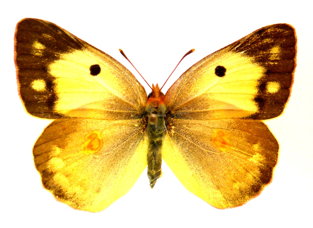 Questa è una femmina della comunissima Colias crocea. La colorazione di questo esemplare è intermedia tra quella "tipica" (giallo aranciato) e quella della cosiddetta "forma helice" (bianco grigiastro); se non ricordo male questa forma femminile veniva denominata "helicina".