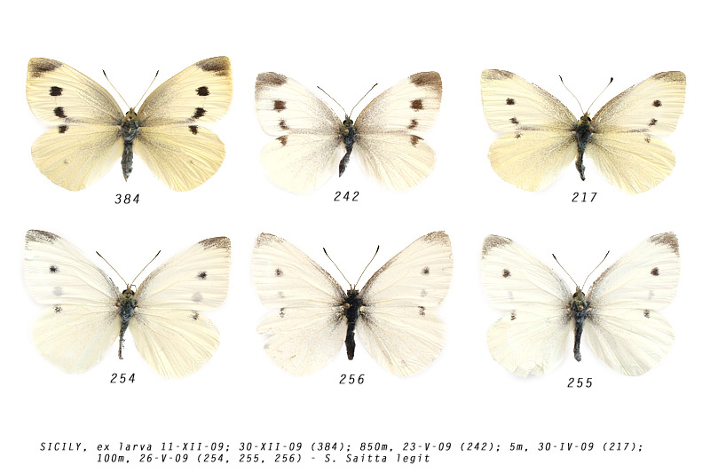 Pieris a confronto Ciao, vado contro le regole del forum postando più di una specie in un topic, ma il confronto mi è fondamentale in questo caso per fissare meglio alcuni concetti. Nello specifico ecco una foto di sei esemplari di Pieris (3 femmine e 3 maschi) che avevo ritenuto tutti P. rapae, ma adesso che osservo meglio ho dei dubbi per l'esemplare 242 e 255 che mi sembrano P. mannii vista l'estensione della macchia apicale. Tutti gli altri mi sembrano invece con assoluta certezza P. rapae... Grazie come sempre,