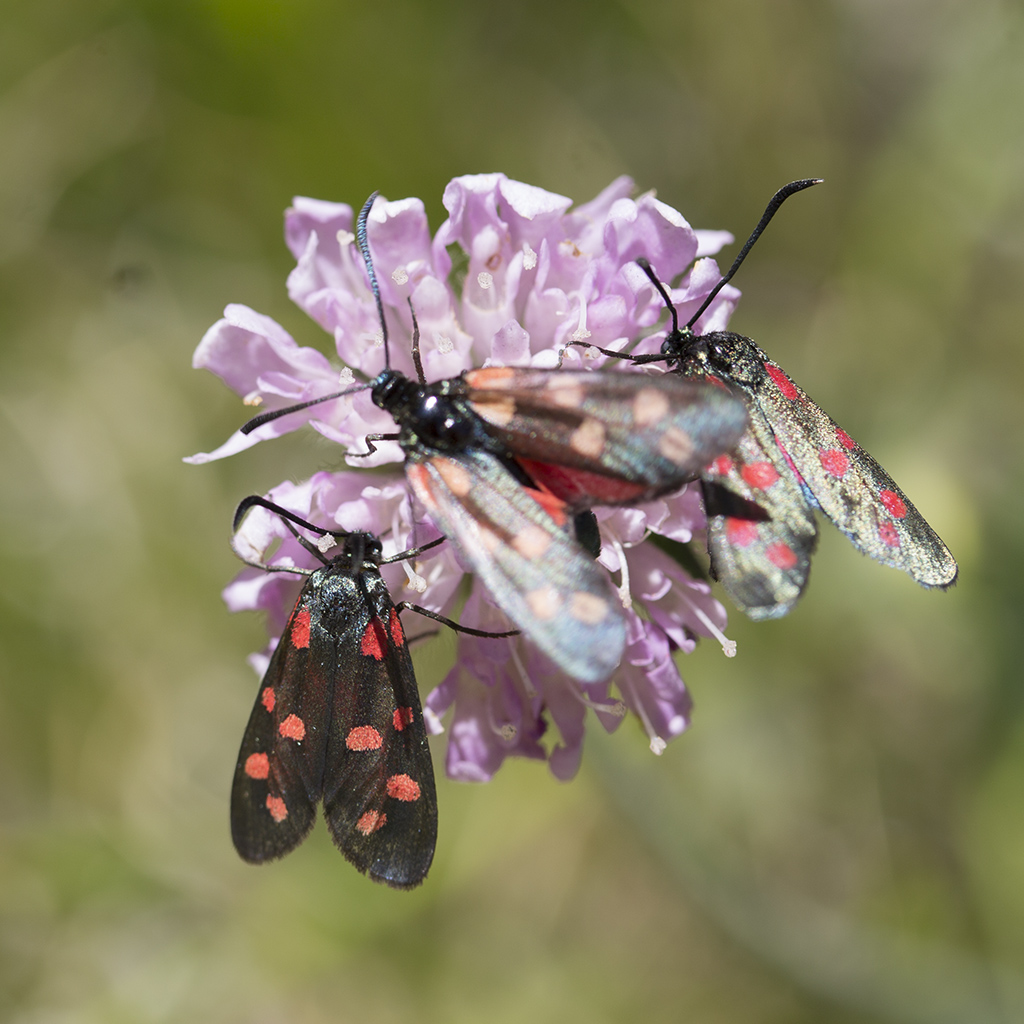 In genere si tende a considerare filipendulae quando hanno sei macchie e la 3 e la 4, le mediane, molto ravvicinate, quasi a contatto, talora fuse se grandi) e transalpina quelle con la 3 e la 4 (ed anche la 5 e 6) ben separate e senza o moderati riflessi metallici nelle ali. In realtà moltissime volte è necessaria la dissezione che mostra come transalpina possa avere netti riflessi metallici. mentre transalpina raggiunge i 2400 m nelle Alpi, filipendulae pare non superare i 2000. Al di là dei dati biologici, io direi che solo quella sullo sfondo, metallica, potrebbe essere una filipendulae, ma per le sole caratteristiche visive, mentre è più facile siano tutte transalpina.