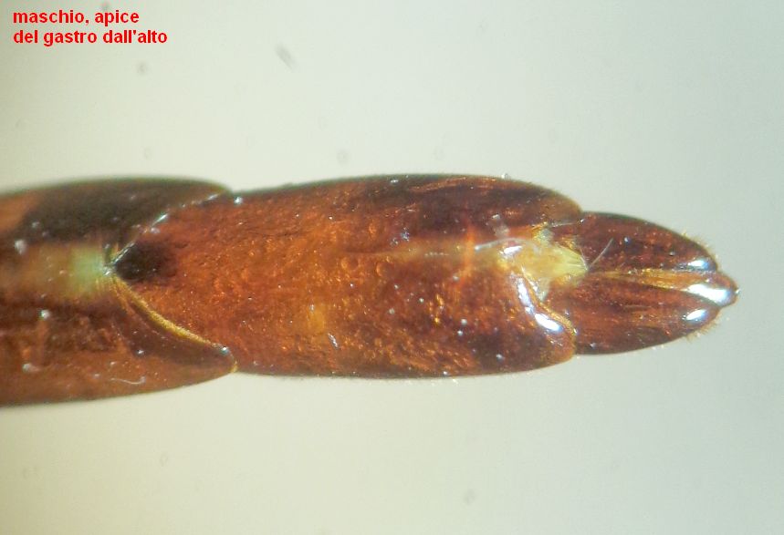 Il maschio ha parameri con caratteristico solco arcuato, largo e punteggiato sopra e ramo inferiore stretto e raggiungente quasi la base del paramero (linea rossa).