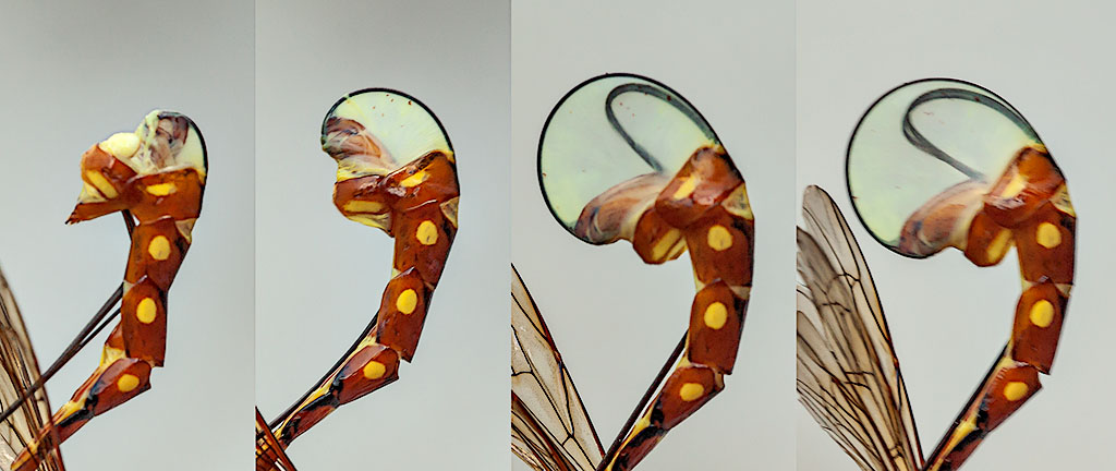 PS: a differenza di Rhyssa, in Megarhyssa si nota bene lo strano meccanismo di ovideposizione, con i segmenti terminali (8 e 9) che si smontano (un po' "stile" Leucospide ma non così spinto) e ruotano e l'ovopositore che si mette in posizione tendendo la membrana tra i segmenti che si vede nell'ultima foto. Vabbé se non mi avete capito, guardate qui: