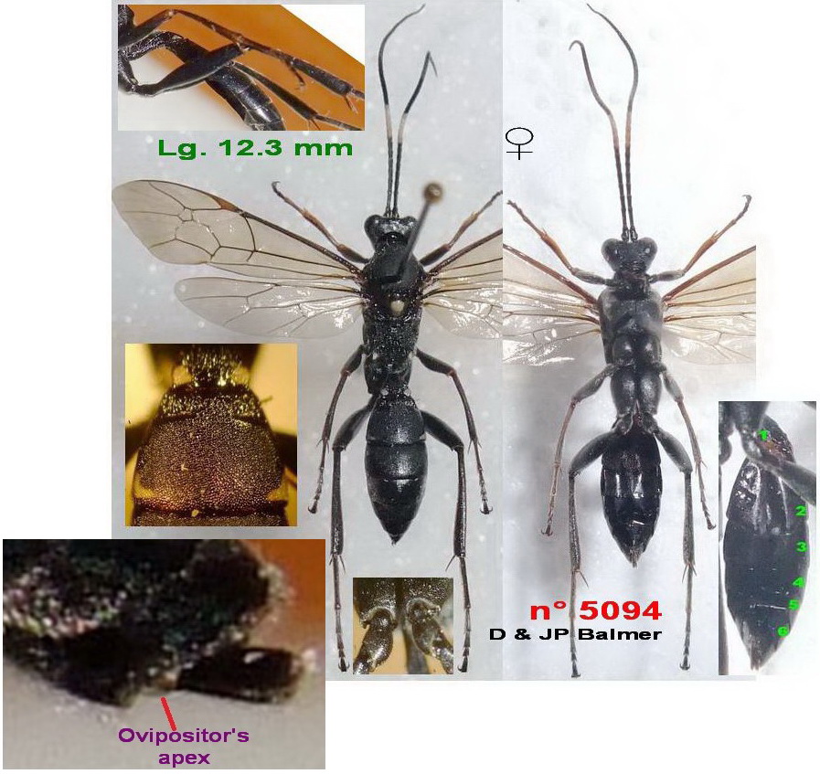 ======== NO : Anisopygus cf. pseudonymus (Wesmael 1845) ♀ ... ERRONEOUS DETERMINATION , THANKS to Geir Ørsnes Determination : Geir Ørsnes ------ Our capture is a ♀, because there are 6 visible Sternits (see photo). --- It was necessary to enlarge strongly the end of the Abdomen to perceive the Ovipositor's apex, what I had not made ! [The sp. pica was captured in Italy]
