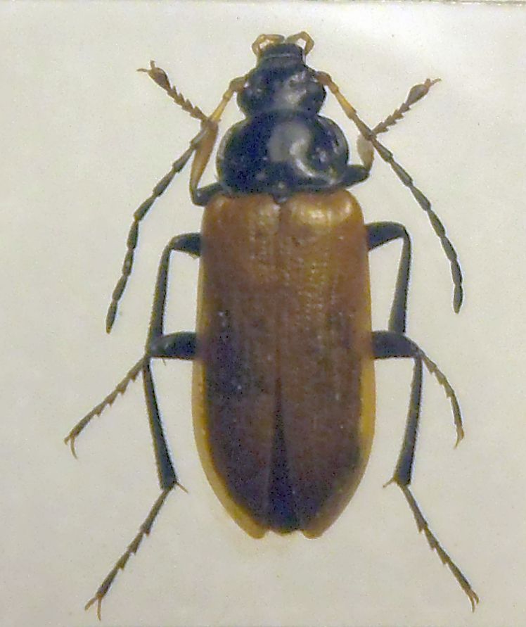 Statura maggiore (fino a 14 mm); pronoto e capo, se esemplari freschi, dotati di pubescenza evidente, lunghetta, bianco argentea; base del pronoto diritta, senza sinuatura davanti allo scutello; epipleure (ovviamente viste di profilo) molto larghe sotto gli omeri, poi ristrette rapidamente e molto bruscamente ridotte in larghezza fino a scomparire quasi all'altezza delle anche posteriori; inoltre concave nella parte più larga, non verticali rispetto alla sezione orizzontale del corpo, ma abbastanza inclinate, circa 45%. ; antennomeri tutti concolori, da bruno scuro a piceo, mai bicolori. Ultimo sternite visibile strettamente inciso all'apice, assolutamente privo di lobo centrale proteso all'indietro.