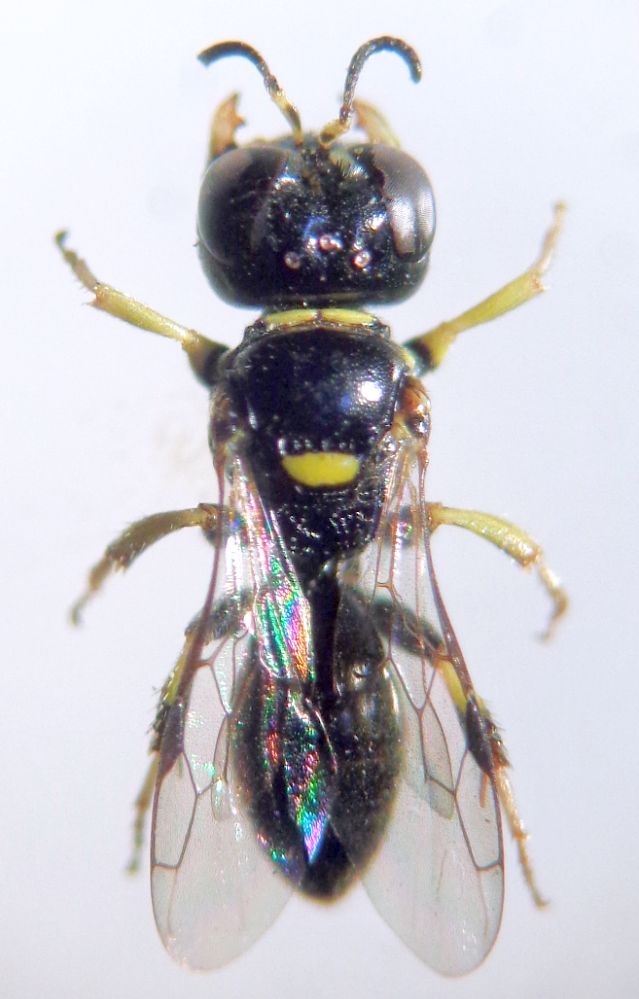 Se lo è, è specie assente nel forum e nella mia raccolta. Femmina, mm 5,15. Bottinava su Edera. I tratti essenziali oltre alla colorazione, sono: - margine clipeale anteriore diritto; - un piccolissimo dente acuto tra le docce scapali; - fovee oculari piccolissime, poco definite, oblique e convergenti verso gli ocelli laterali; - area pigidiale apicalmente arrossata, con grossi punti e debole carena longitudinale centrale.