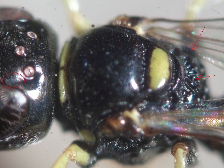 Posto una foto dei lati del propodeo nei quali mi pare si vedano strie molto evidenti salvo un'area con soli punti fini nella zona medio-distale. La specie dovrebbe avere "strie nei lati del propodeo" mentre in pygmaeus si dice "lati del propodeo lisci". A confronto, posto tra poco un secondo esemplare del tutto simile in apparenza a quello di Giuseppe.