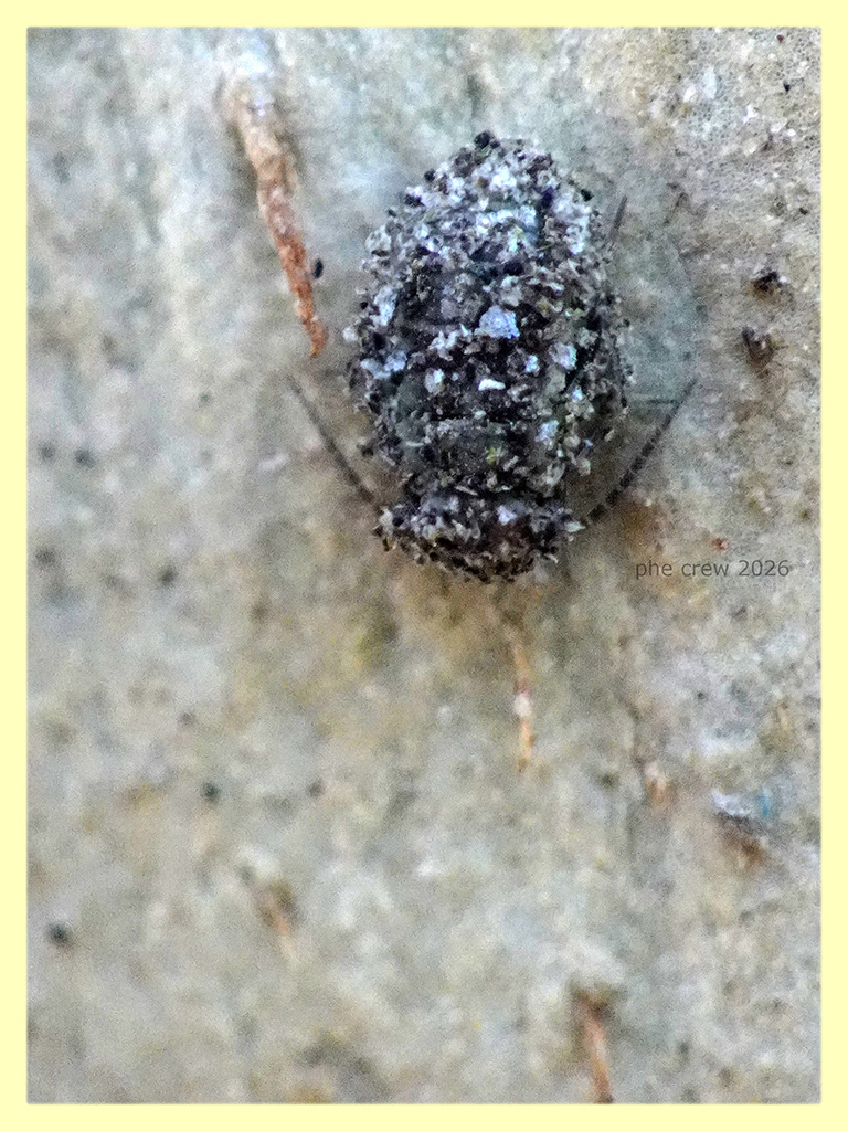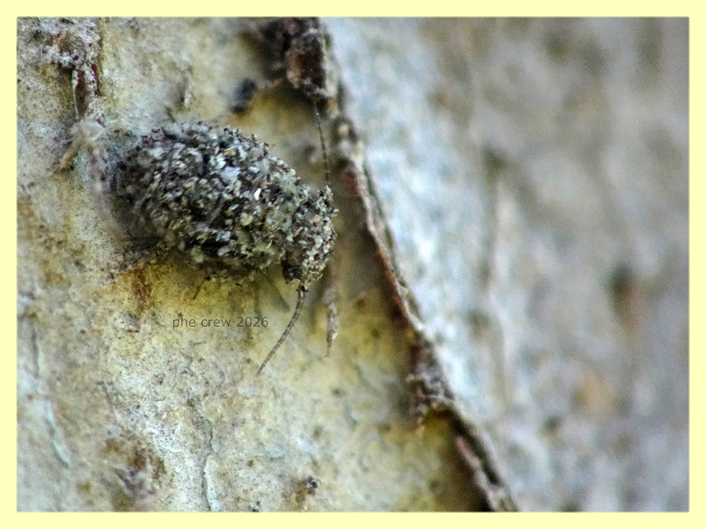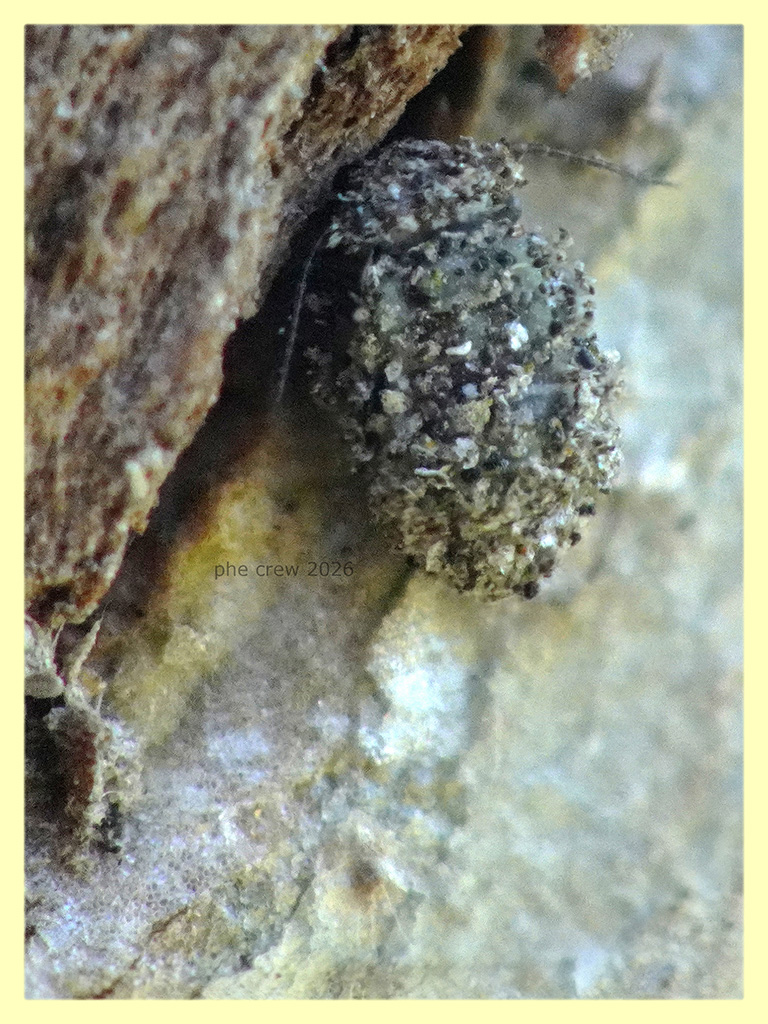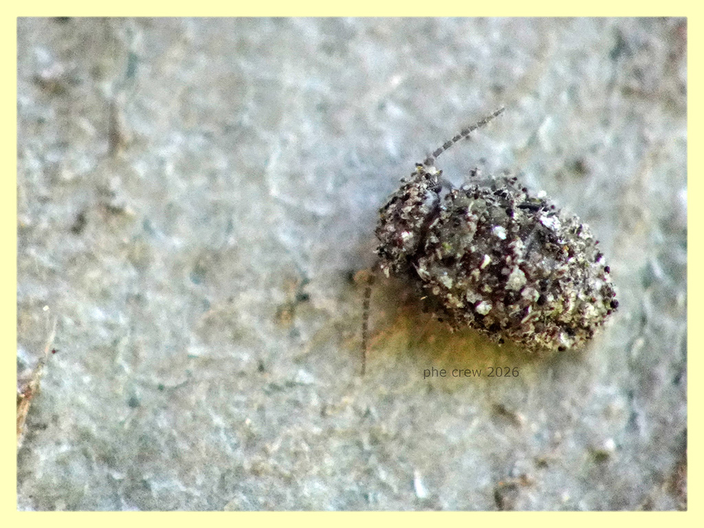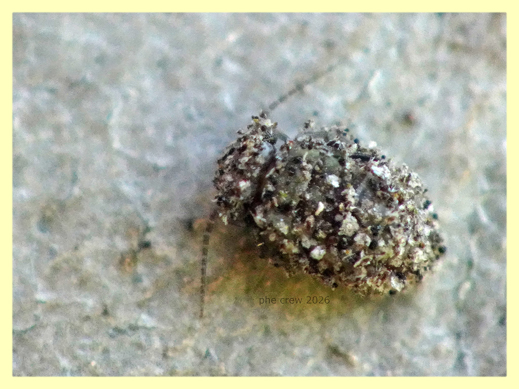 ....sotto corteccia di Eucalipto ho trovato questa unica ninfa di Psocottero, l' ho riconosciuta dalle antenne, dal portamento e poi si intravede un filino l' addome con la testa e gli occhi. Non credevo che anche le ninfe (alcune) di Psocottero adottassero questo comportamento di riempirsi il corpo di piccoli materiali e residui trovati nell' ambiente circostante....un po come fanno alcune larve di Chrysopidae quando cacciano.......questo Psocottero pero' porta sicuramente un atteggiamento difensivo anziche' da cacciatore in agguato. Come si chiama precisamente questo mimetismo ? ....si puo' chiamare mimetismo attivo ?