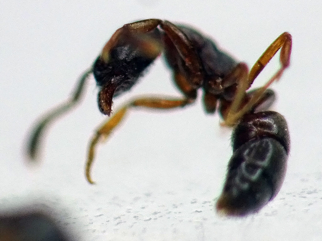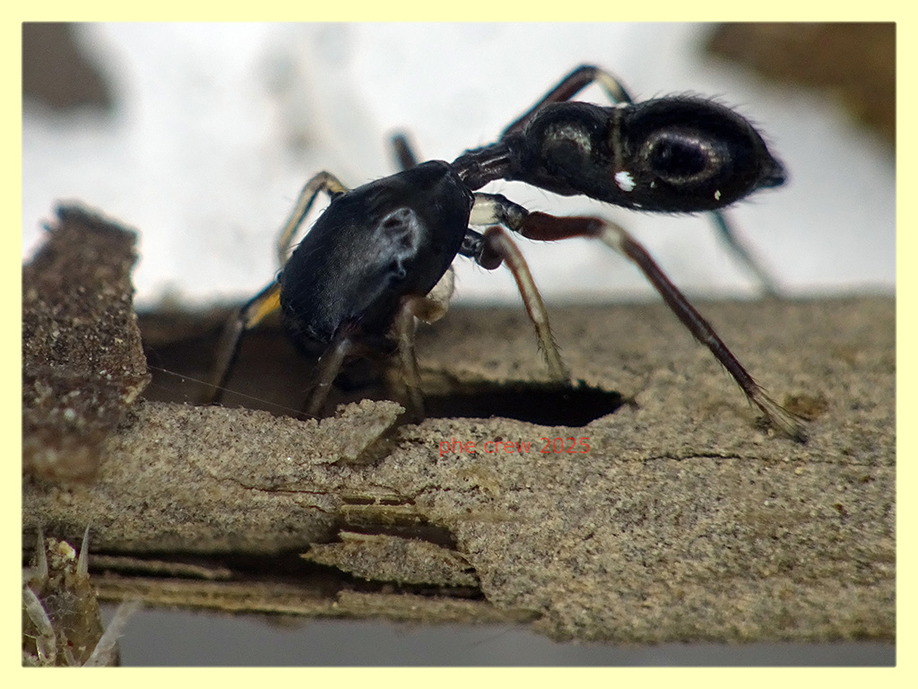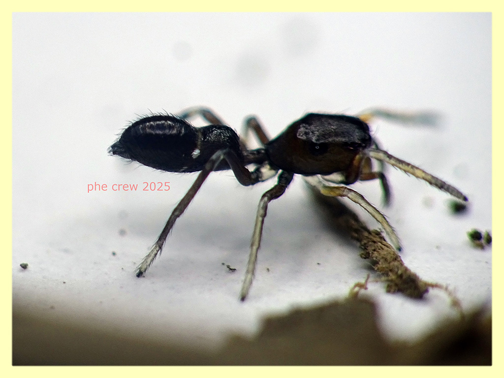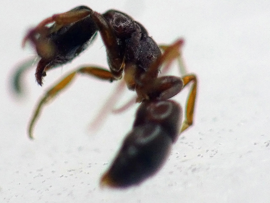 ......stamani ho ravanato nel terriccio per bene ....e finalmente le ho trovate ...le Formiche (e l' unica specie trovata) a cui il Salticide sembra proprio faccia da mimo. Gli ho fatto velocemente delle brutte foto giusto per capire almeno il genere....misurano circa 2,5 mm. Erano tutte belle vispe quando le misi nel barattolino microforato insieme al Salticide che era li gia da gg. insieme a altri insettini che gli hanno fatto da cibo e insieme a delle micro cannucce secche di chissa' quale pianta prese insieme al fogliame morto dal posto da cui le ho prelevate.....e che gli hanno fatto da tana infilandocisi dentro. Il Salticide era nella parte alta del barattolo e scrutava le Formiche che fin li non sarebbero mai arrivate. Dopo qualche ora vado a sbirciare e le trovo cosi' come da foto....stecchite ! Gli altri insettini ancora tutti vispi e il Salticide si era infilato di nuovo in una cannuccetta. Secondo voi le ha solo uccise per difesa ?....non sembrano masticate/ciucciate.... :? ....