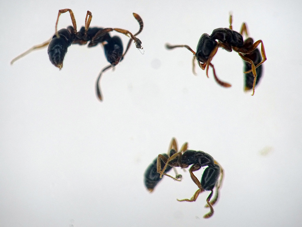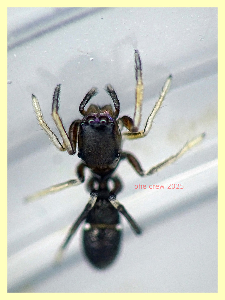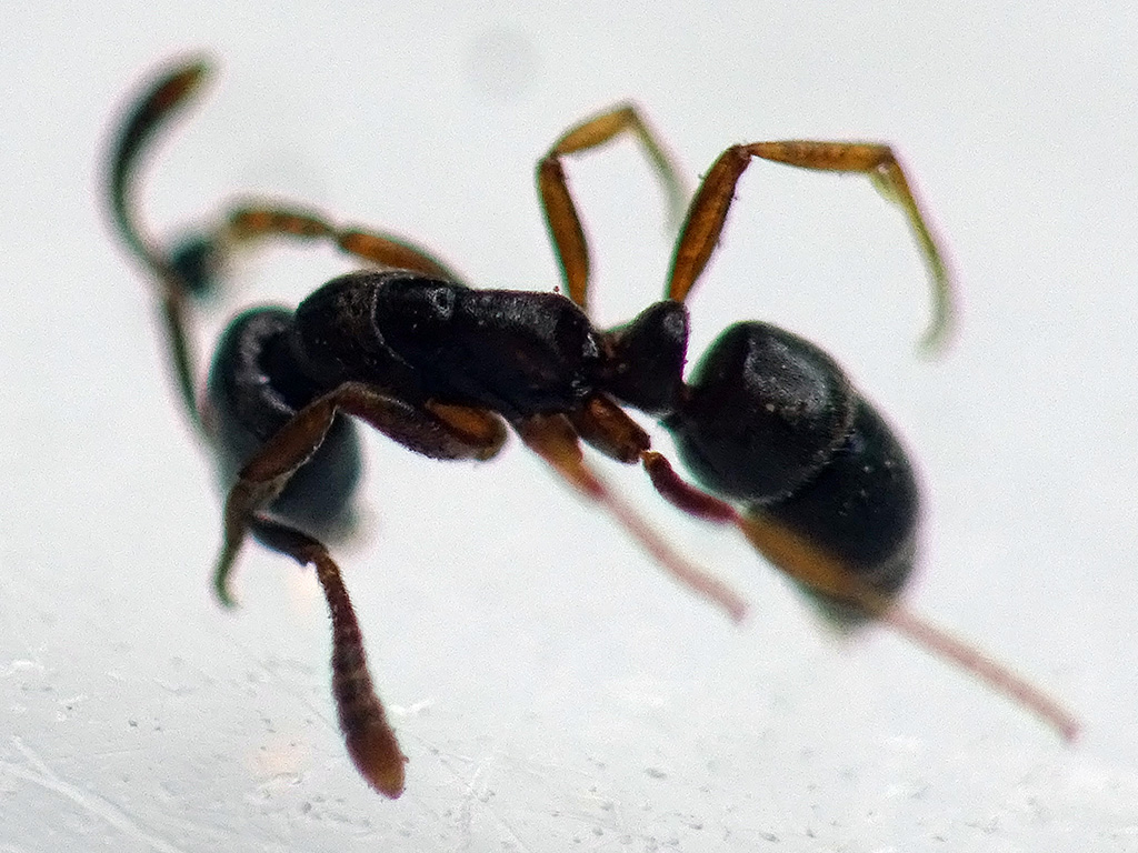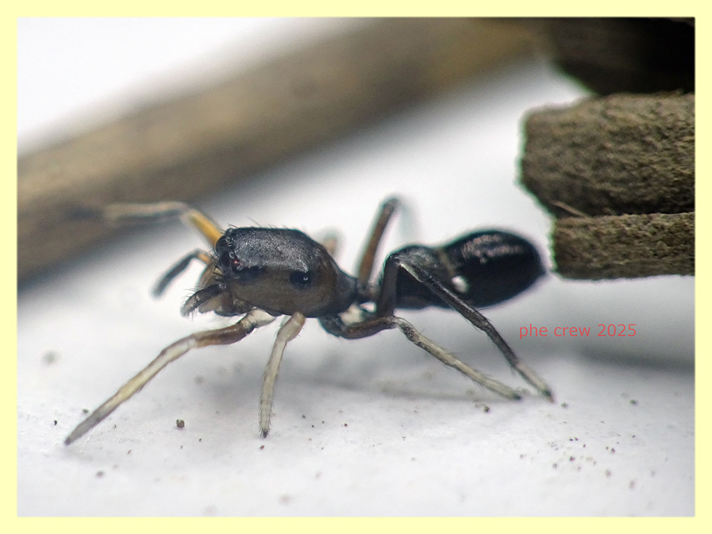 ......stamani ho ravanato nel terriccio per bene ....e finalmente le ho trovate ...le Formiche (e l' unica specie trovata) a cui il Salticide sembra proprio faccia da mimo. Gli ho fatto velocemente delle brutte foto giusto per capire almeno il genere....misurano circa 2,5 mm. Erano tutte belle vispe quando le misi nel barattolino microforato insieme al Salticide che era li gia da gg. insieme a altri insettini che gli hanno fatto da cibo e insieme a delle micro cannucce secche di chissa' quale pianta prese insieme al fogliame morto dal posto da cui le ho prelevate.....e che gli hanno fatto da tana infilandocisi dentro. Il Salticide era nella parte alta del barattolo e scrutava le Formiche che fin li non sarebbero mai arrivate. Dopo qualche ora vado a sbirciare e le trovo cosi' come da foto....stecchite ! Gli altri insettini ancora tutti vispi e il Salticide si era infilato di nuovo in una cannuccetta. Secondo voi le ha solo uccise per difesa ?....non sembrano masticate/ciucciate.... :? ....