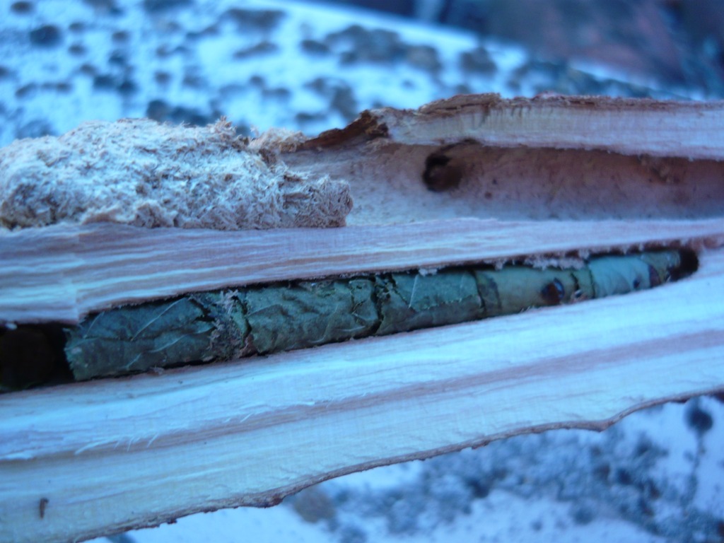 Le cellette sono proprio di Megachile, fatte di ritagli di foglie. I poveri insetti che ne sono usciti, sono ditteri Sarcophagidae Miltogramminae, cleptoparassiti. Spesso le cellette di Megachile sono pesantemente parassitate, probabilmente ne usciranno altri (speriamo non facciano la stessa fine...!) così come forse uscirà anche qualche megachile (aspettiamo altre foto)... Ciao! Maurizio
