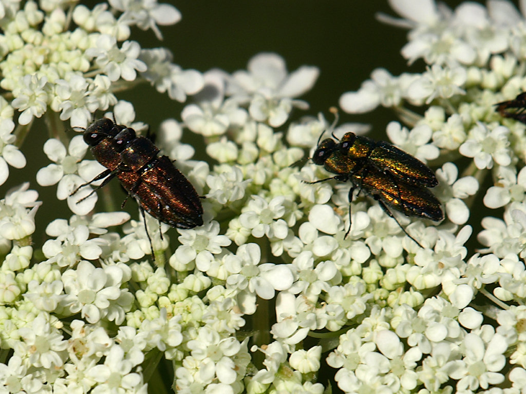 La popolazione di A.millefolii polychloros in questa limitata fascia di territorio presenta tutte le femmine androcrome (almeno, tutte quelle viste da me in diversi anni, e sono parecchie). Quando credevo di aver trovato femmine scure, "normali", mi accorgevo poi, controllandole meglio, che altro non erano che Anthaxia umbellatarum, su cui andavano, evidentemente per sbaglio, dei maschi di millefolii polychloros. Del resto, frequentano gli stessi fiori nello stesso momento, come si vede da quest'altra foto, sempre di san Vittorino, con una coppia di umbellatarum (scure) e una di polychloros (verdi).
