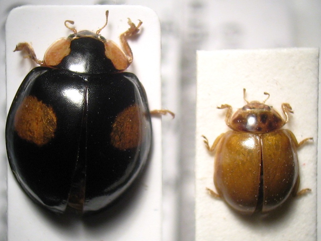 mmmh. Mi sono riguardato le due specie in questione al microscopio e mi sa che debbo abbandonare l'idea che sia una Adalia decempunctata. Ho notato che queste hanno uno scalino all'apice delle elitre ben più evidente che in Harmonia axyridis, oltre ad essere più ovali. Nella foto non si vede bene ma questa ha solo una lievissima depressione all'apice quasi come in axyridis ma molto debole (è facile che un individuo sottosvilupato abbia rilievi meno evidenti). Certo però è davvero piccola. Di axyridis ne ho/avevo una sola ed il paragone è impressionante. Potrebbe essere qualcos'altro ancora? ps: Tocca che trovo altre Harmonia axyridis per ampliare la mia variabilità.