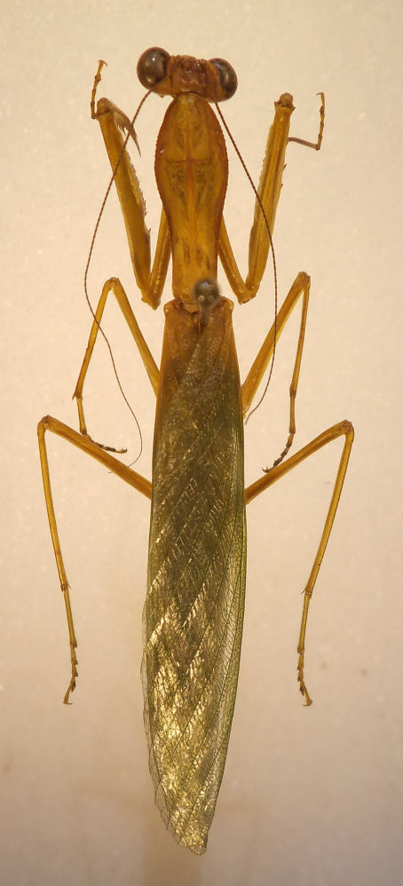 Oggi Giorgio (che ringrazio ancora) mi ha portato alcune mantidi, tra le quali una come quella di questa discussione. Avendola vista anche di lato, la trovo piuttosto dissimile da Tarachomantis hova. Ora ho estratto i genitali, che domani guarderò al microscopio. Intanto rinomino la discussione.