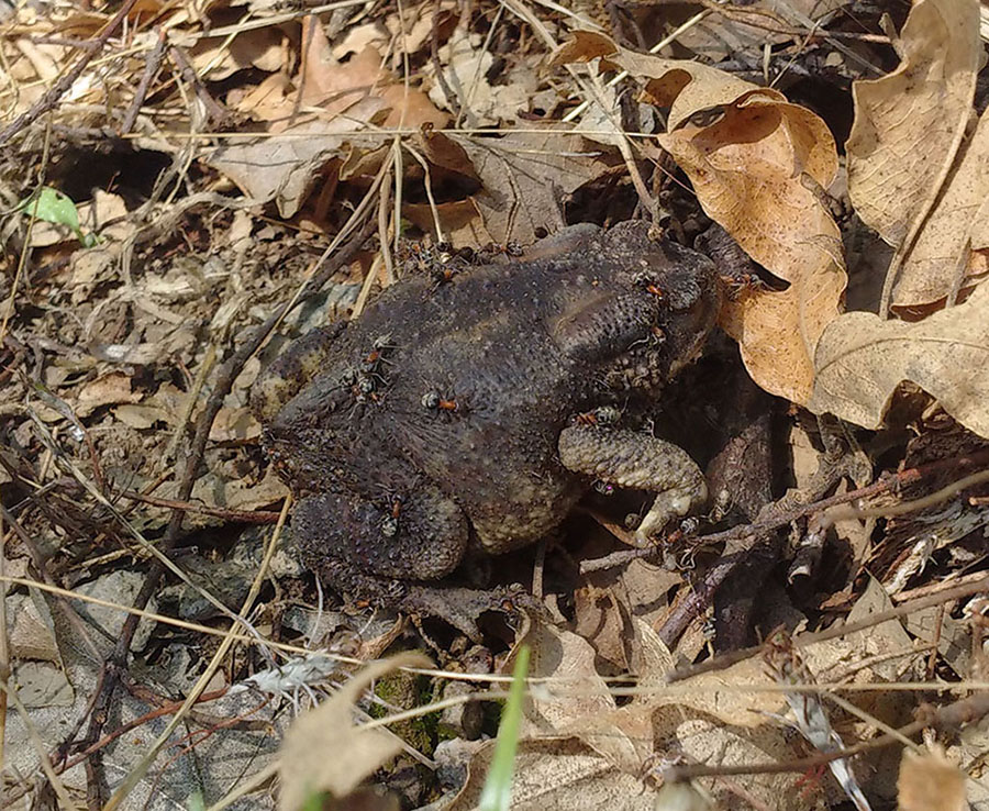 La foto è scattata con un cellulare, non ho di meglio e me ne scuso. Si può dire qualcosa di questi Imenotteri che il Bufo bufo si porta a spasso per il bosco? Grazie