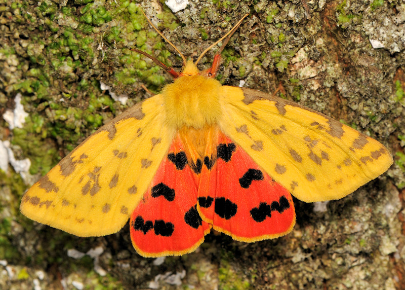 Una specie decisamente vistosa ma che non si incontra tanto spesso: Rhyparia purpurata (Linnaeus, 1758), Purple Tiger per gli inglesi, Arctiidae a volo estivo e bruco maturo a fine primavera, presente soprattutto in media montagna, su terreni aridi e sassosi, bruco polifago su piante basse, facile da trovare nel tardo autunno e inverno sotto i sassi. Le foto ritraggono una femmina (Gran Sasso [AQ], 1300 m, larva trovata su una Scrophularia e allevata in cattività) C'è una specie superficialmente simile ma strettamente legata agli ambienti umidi, Rhyparioides metelkana (Lederer, 1861), bruco su Iris pseudacorus, fino ad ora mai trovata in Italia e presente qua e là in Europa, in diminuzione per riduzione degli habitat (stagni e torbiere con vegetazione ripariale) a cui è legata |