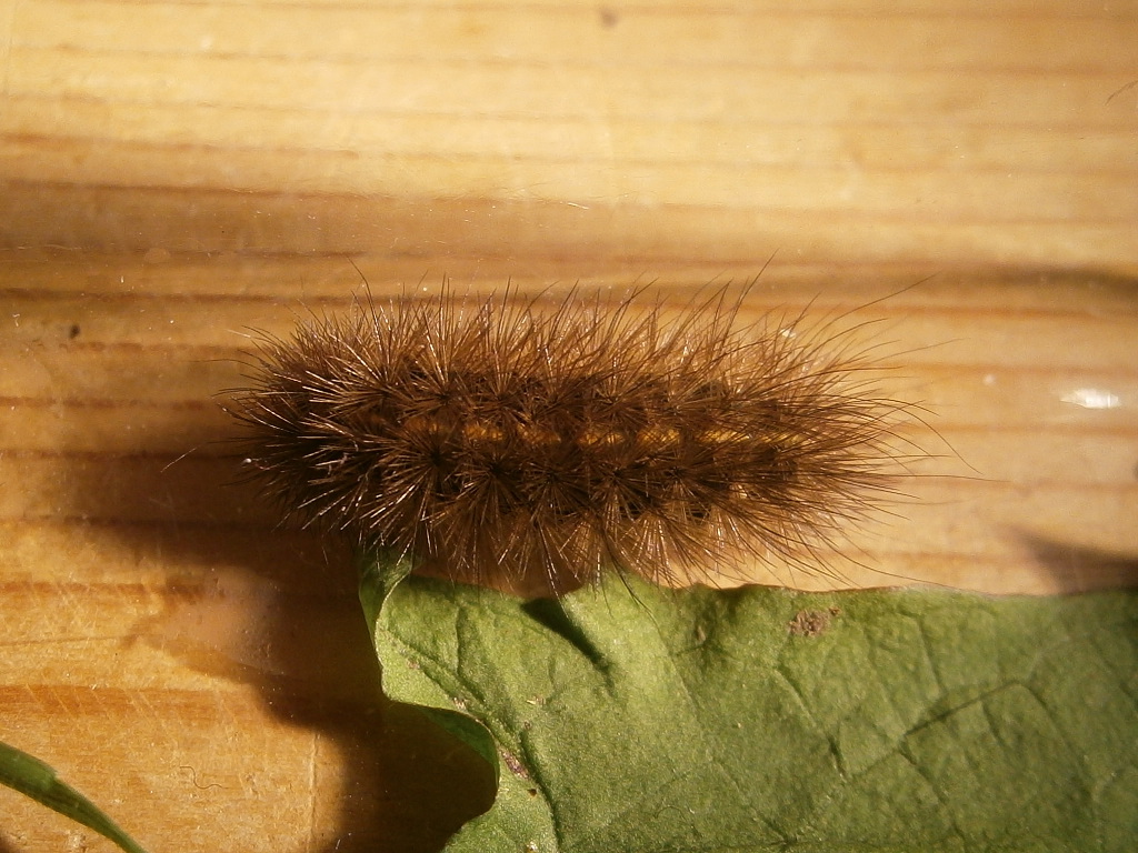 Ho trovato questo bruco sul marciapiede del mio giardino dove cresce per lo più Tarassaco. E' marrone ed ha una linea gialla che decorre ininterrotta lungo tutto il dorso. Non so se sia Spilosoma lubricipeda o Phragmatobia luctifera?