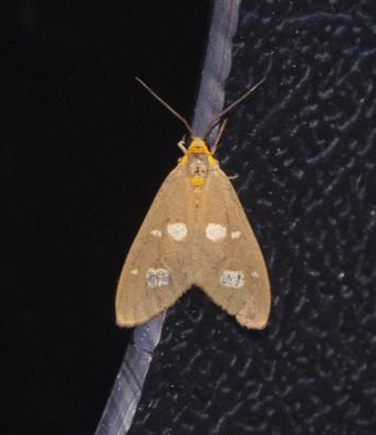 Dysauxes famula, meno contrastata e con le due macchie marginali gemelle fuse in una sola |