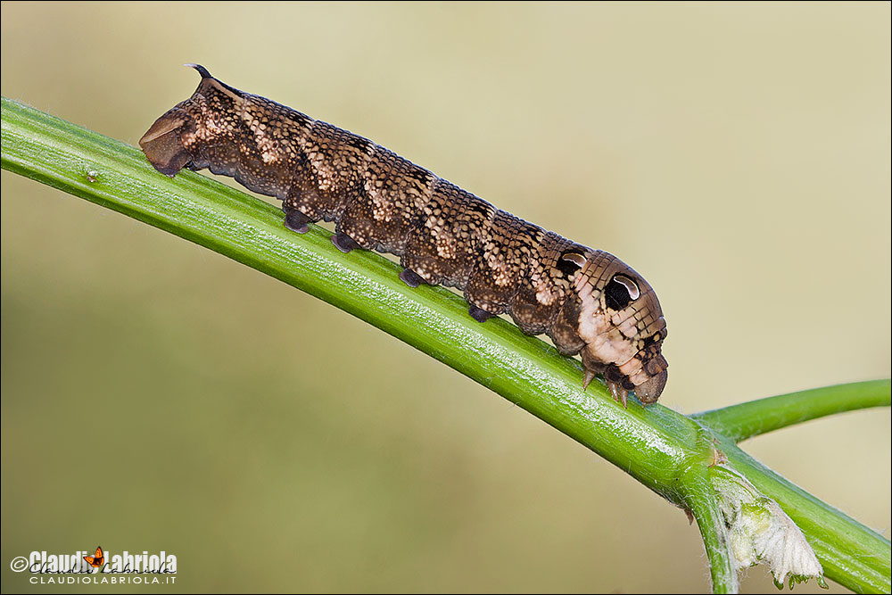 le foto ritraggono la larva della Sfinge della vite, Deilephila elpenor (Linnaeus, 1758) una bellissima specie appartenente alla famiglia Sphingidae.