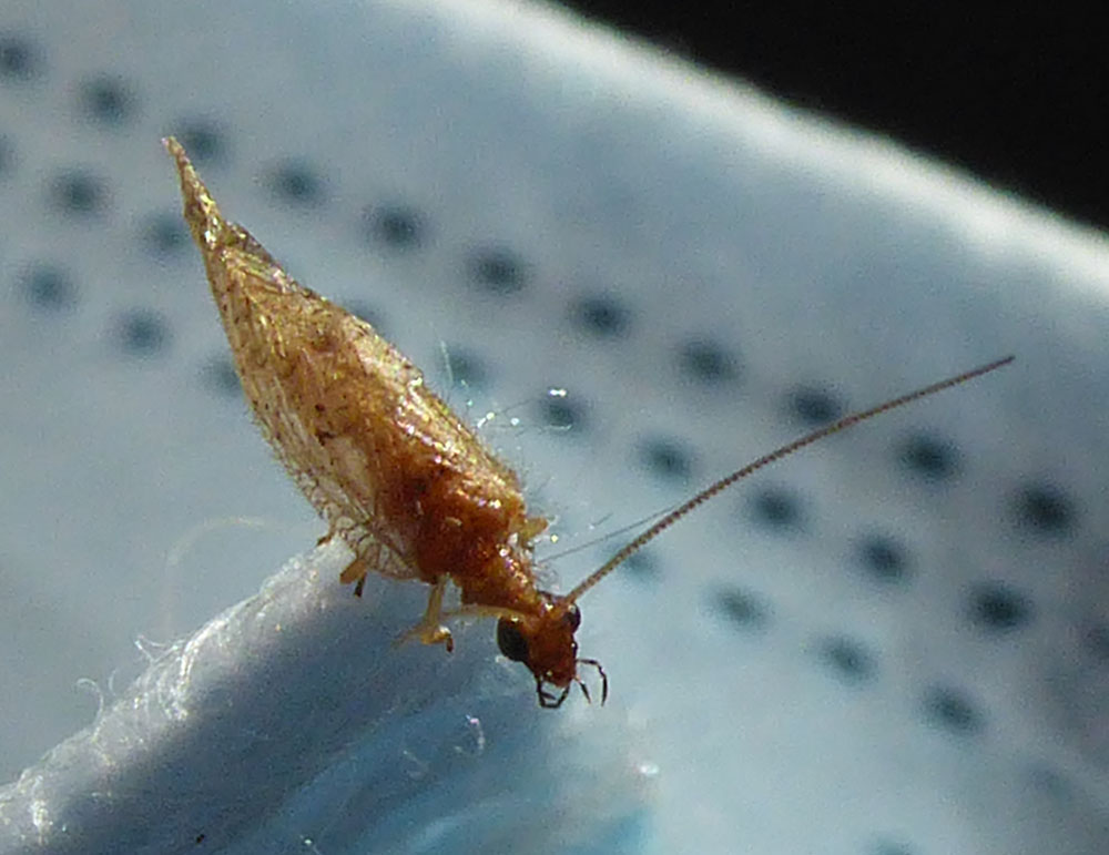 Si tratta con certezza di un Emerobiide e l'aspetto e il colore fanno pensare soprattutto a Micromus angulatus. Ma l'esemplare è fortemente danneggiato perché le sue ali in fase post-sfarfallamento, ancora tenere e un po' umide, si sono appiccicate tra loro invece di distendersi perfettamente e consolidarsi normalmente. La specie che ipotizzo come più che probabile è una delle poche, tra gli Emerobiidi italiani, che vivono e si sviluppano soprattutto a livello di vegetazione erbacea. Può darsi che in un prato o in un giardino l'insetto neosfarfallato su un filo d'erba sia stato sfiorato dall'estremità dei pantaloni finendo sul calzino e così subendo, ancora delicato e molliccio, lo spiacevole inconveniente.