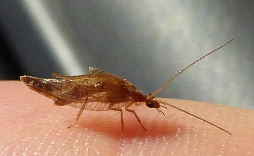 Buongiorno! Ieri mi sono trovato questo sul calzino. Non so assolutamente cosa sia; la cosa a cui somiglia di più sono i crisopidi (girando un po' online ho visto che ce ne sono di marroni, famiglia Hemerobiidae), quindi lo metto tra i neurotteri, però già solo la forma delle ali è diversa, quindi boh...