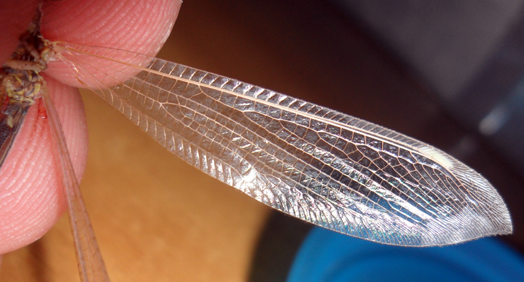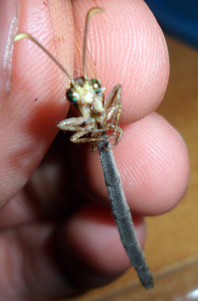 Questo Myrmeleontidae l'ho raccolto oggi insieme a Leonardo, mi è volato vicino e ho pensato fosse un Odonato, ma quando si è posato su uno stelo mi sono accorto che era tutt'altra cosa. Ho provato a prenderlo due volte al volo con il retino, alla fine l'ho preso con le mani appena si è posato.