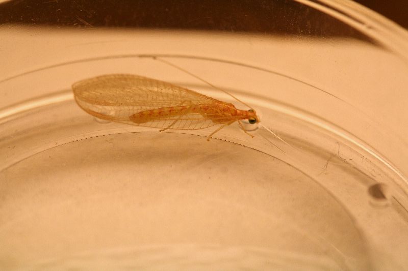 Mettigli dei fogliettini di carta dentro la provetta, non c'è nulla come rimanere aggrappate alla plastica o la vetro che danneggia le crisope. Poi una gocciolina di acqua e miele, ma piccola piccola che non possa andarsi ad impiastricciare (gliela puoi trasferire con uno spillo triplo zero). Poi nel frigo di casa, che ci passa un'altro mese senza problemi. Se ne trovi altre potrebbero servirmi (VIVE!), questa è una femmina.
