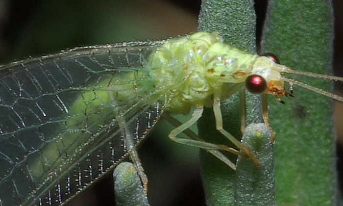 E l'ingrandimento della Chrysoperla "forse" lucasina. Ingrandite sono decisamente diverse, basta la dimensione degli occhi, potevo pensarci un pò prima di scrivere che mi sembravano la stessa specie .
