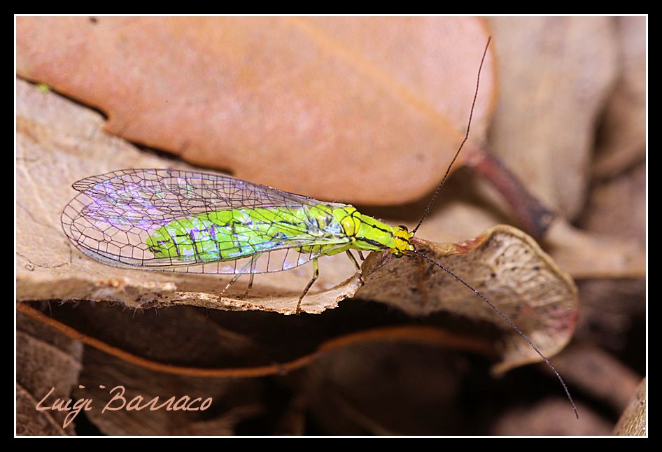 Si tratta di Hypochrysa elegans (Burmeister, 1839), probabilmente il solito maschio che in questa stagione rimane a mangiare polline nelle radure (biancospino, rosa). Una cosa normale quindi, e tuttavia trovo questo reperto quasi eccezionale. A parte che guardando qui e qui mi sa che sia la popolazione nota più meridionale d'Italia, e secondo la bibbia dei neurotterologi [Neuropteren Europas, 1980] la più meridionale in assoluto, dov'è il faggio?