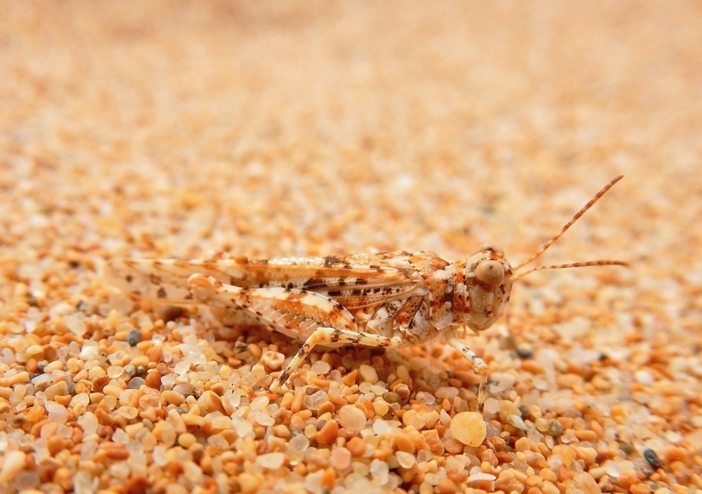 Da notare come raggiunga lo stesso risultato dell'Asida del mio post, ma in modo differente: questo Ortottero con la cuticola di colorazione praticamente identica al substrato, il Tenebrionidae, ricoprendosi del substrato stesso, nella fattispecie, di granelli di sabbia.