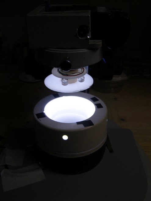 Cita: Due settimane fa sono stato al museo di Genova e parlando con Fabio Penati ho saputo che il Sig. Alessandrini, che commercializza microscopi e c'è sempre a Modena, ha cominciato a lavorare con un ingegnere a un sistema di illuminazione specifico per la microfotografia. Si tratta di una sorta di campana che ho visto già da qualche parte (in un sito americano o russo). Ciao Iuri, io mi sono autocostruito un sistema circa simile