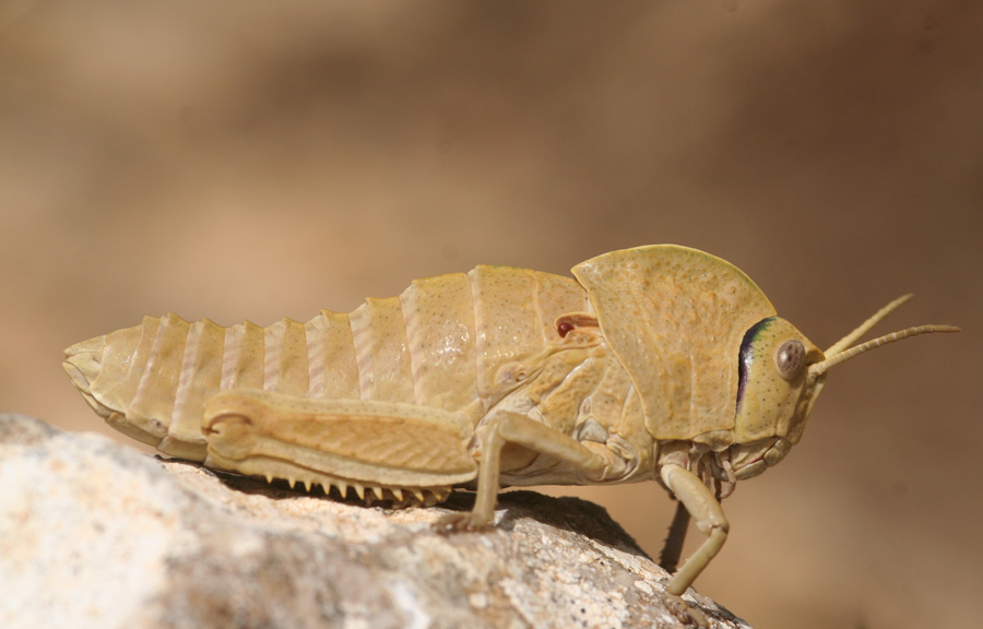Qualche giorno fa sui monti di Palermo ho fotografato questo Pamphagidae che ho identificato come Pamphagus marmoratus sia per il numero di articoli antennali che per l'assenza di una profonda intaccatura nel pronoto caratteristica di Acinipe calabra. Quello che mi incuriosisce è la colorazione che a differenza della forma più comune del P. marmoratus, verde, è giallo-nocciola. ma forse sto prendendo una cantonata e si tratta di una Acinipe calabra...