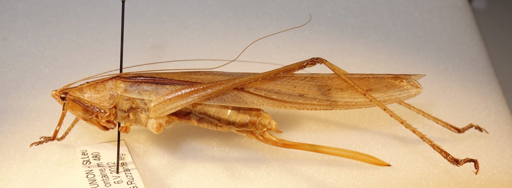 Conocephalidae, Copiphorinae. In effetti ricorda molto le nostre Ruspolia (però sicuramente non è R. nitidula che ha l'ovopositore diverso e una differente distribuzione), ma non conosco la fauna esotica. Mi documento e ti so dire.