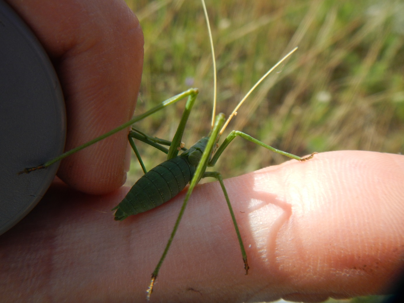 Vi mostro due brutte foto di questo ortottero più che altro per la località inedita. Questa è infatti la prima segnalazione per l'Emilia-Romagna e la seconda per il nord Italia (l'altra riguarda una località veneta). In realtà non ho la piena certezza dell'identificazione. I giovani infatti non hanno ancora la forma dei cerci e dell'ovopositore definitiva, pertanto mi sono portato a casa un sub-adulto nel tentativo di fargli raggiungere la maturità in laboratorio. Questo perché in natura diviene molto difficile individuare gli adulti che, a differenza di giovani praticoli, abitano le chiome alte degli alberi e degli arbusti, scendendo a terra solo in particolari orari per nutrirsi di foglie (specialmente di carduacee). La specie con cui può essere confusa è Acrometopa italica, che però si incontra più tipicamente nella costa tirrenica. Ciao. Marco. |