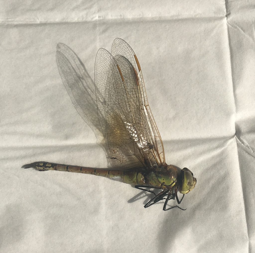 Ciao. Dovrebbe essere una Anax ephippiger (Burmeister, 1839) - Aeshnidae. Se non vedo male una femmina. La forma dell'ala, con i suoi particolari, è da Anax. E così pure le appendici. I colori non aiutano molto se non l'ombreggiatura delle ali posteriori che confermerebbe l'ipotesi. Ciao, Matteo.