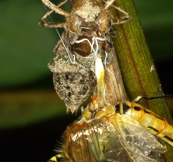 in realtà negli odonati non sono rari gli incidenti di sfarfallamento, soprattutto in allevamento in condizioni non idonee (acqua non pulita, non sufficientemente ossigenata etc.), ma a volte per cause indeterminabili; in pratica in una parte del corpo non avviene il distacco tra exuvia e cuticola neoformata, e l'insetto resta imprigionato nell'exuvia
