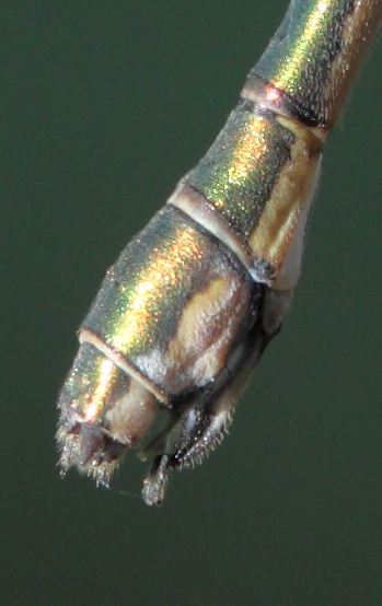 Non riesco a capire se si tratta di Lestes viridis o di Lestes parvidens la cui femmina dovrebbe essere distinguibile dalla femmina di viridis soltanto contando nella parte inferiore dell'apparato ovopositore da 6 a 8 dentelli...con una lente di ingrandimento. A me i dentelli sembrano 4 e quindi opterei per la viridis.