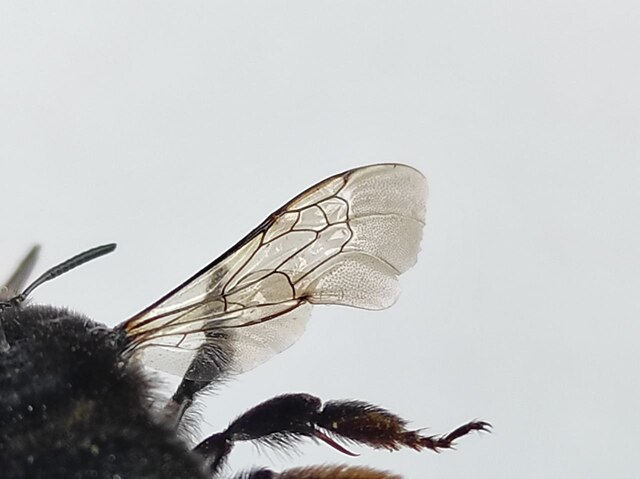 - colorazione totalmente nera ad eccezione della peluria presente su tibia e basitarso posteriori che è arancio brillante