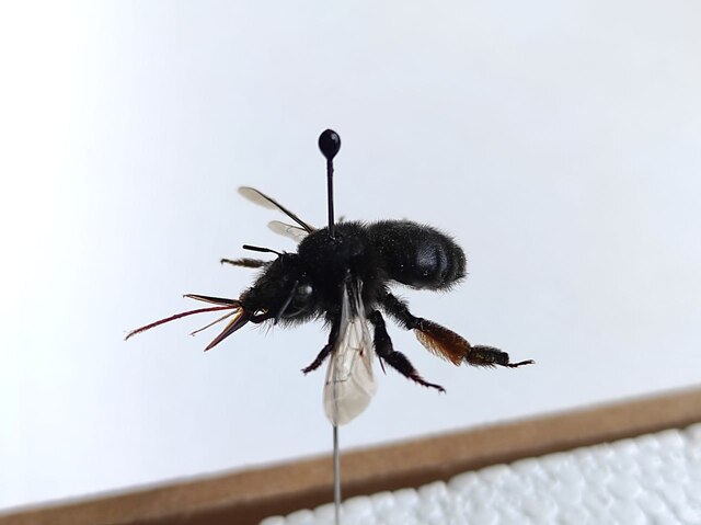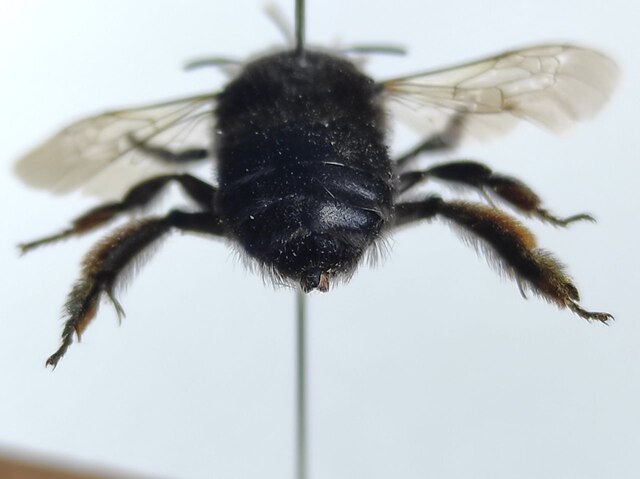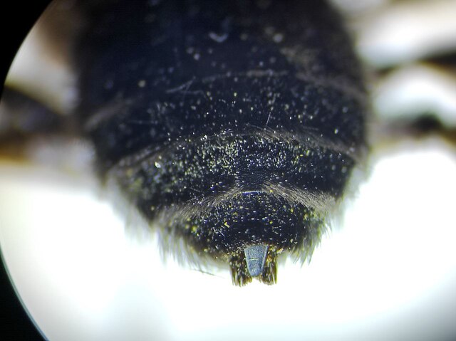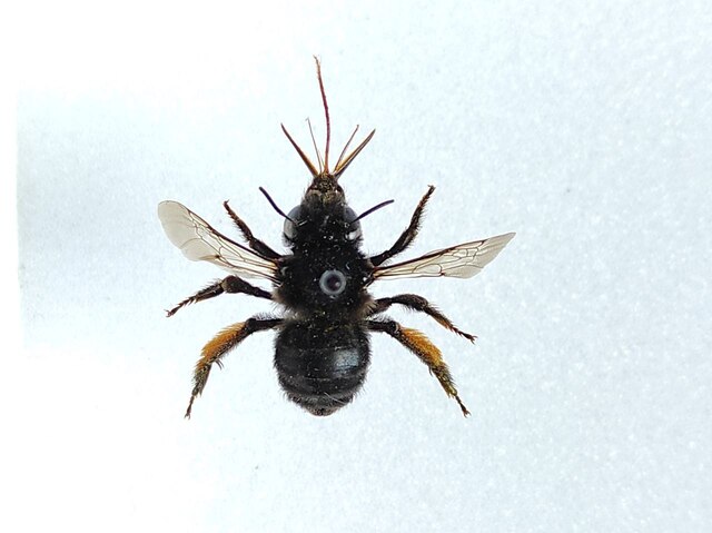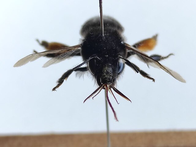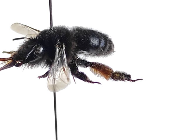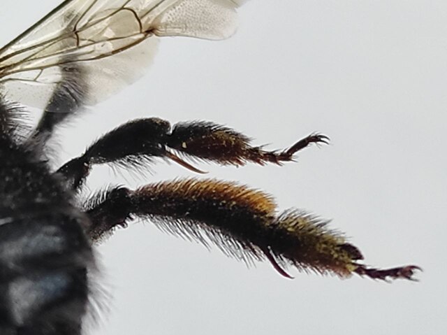 - colorazione totalmente nera ad eccezione della peluria presente su tibia e basitarso posteriori che è arancio brillante
