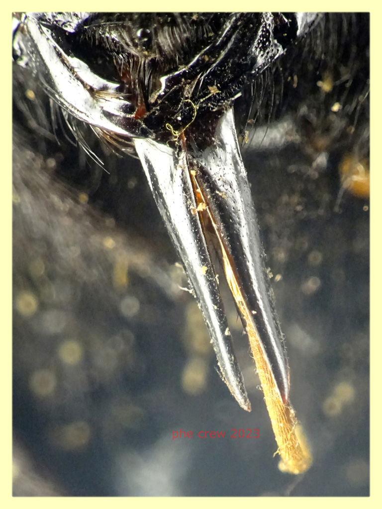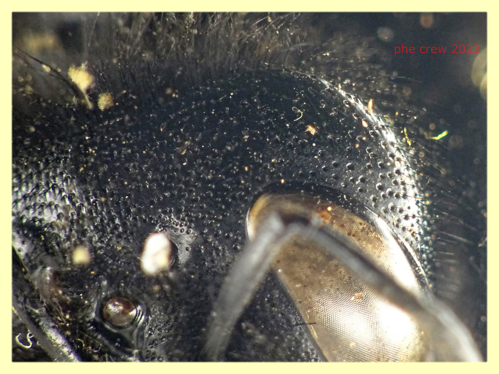 ...questo Imenottero l' ho trovato stecchito sul ciglio della strada, cosi' come da foto dalla testa all' addome misura circa 21 mm. e dalla revisione degli Xylocopinae di Francia e Belgio di Terzo, Iserbyt e Rasmont del 2007 arrivo a una femmina di Xylocopa violacea. Posto alcuni dettagli (quelli che sono riuscito a fotografare) per l' identificazione: segmenti antennali 12 (quindi femmina), scultura della testa, tibia posteriore e la sua "forma di calli" (non so come chiamarla).