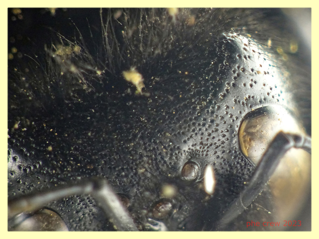 ...questo Imenottero l' ho trovato stecchito sul ciglio della strada, cosi' come da foto dalla testa all' addome misura circa 21 mm. e dalla revisione degli Xylocopinae di Francia e Belgio di Terzo, Iserbyt e Rasmont del 2007 arrivo a una femmina di Xylocopa violacea. Posto alcuni dettagli (quelli che sono riuscito a fotografare) per l' identificazione: segmenti antennali 12 (quindi femmina), scultura della testa, tibia posteriore e la sua "forma di calli" (non so come chiamarla). |