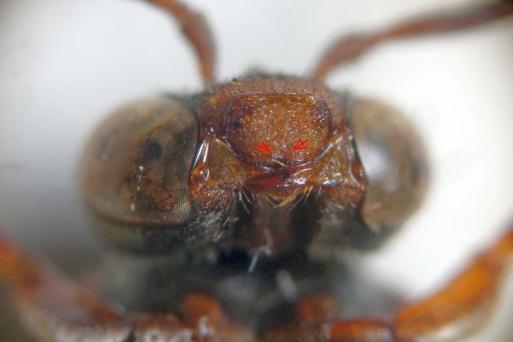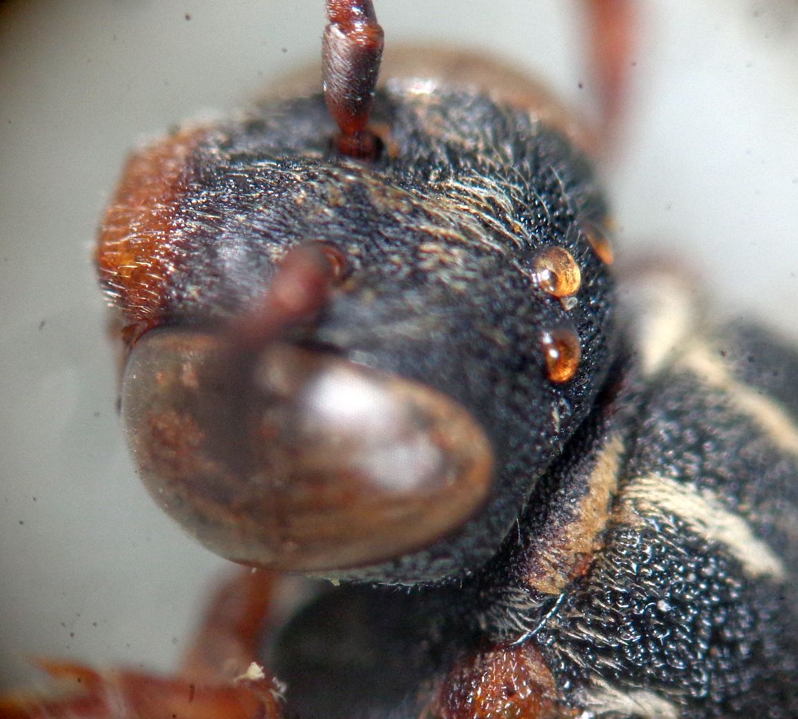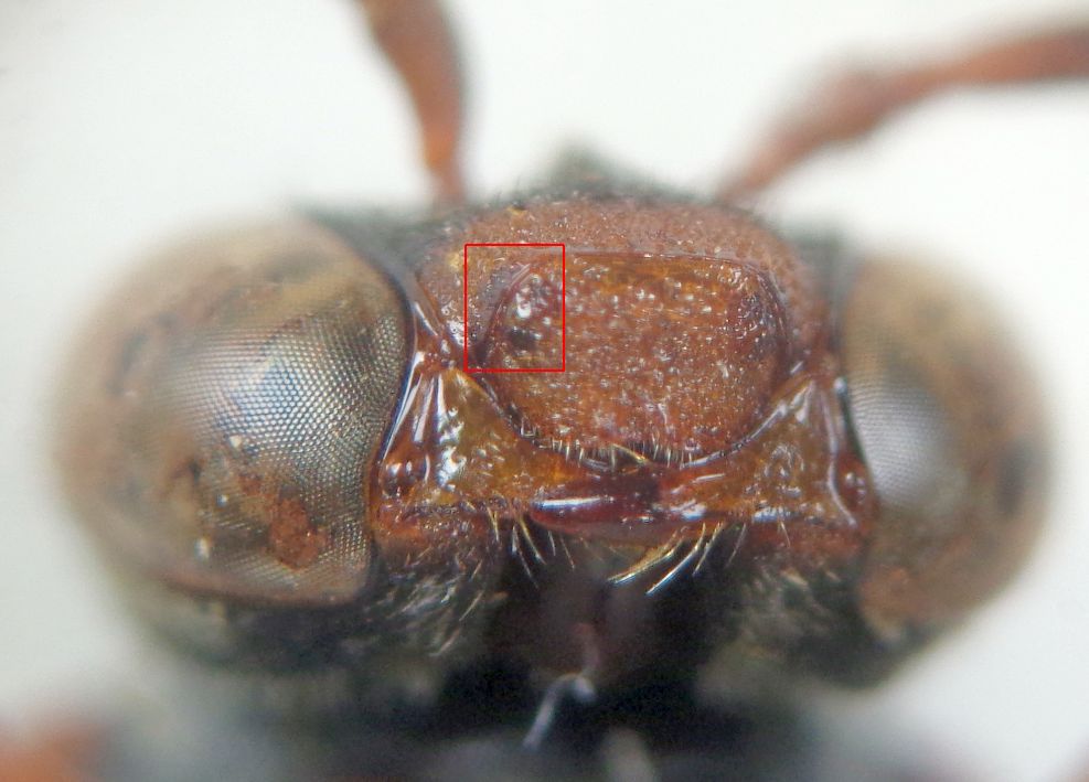 Pensavo bastasse la forma generale del labbro; ecco comunque un ingrandimento dello stesso; se non basta, ho comunque un altro esemplare stessi dati ed identico che è disponibile. L'intero margine del clipeo è bordato in rilievo ed il labrum almeno anche ai lati (rettagolo); l'apice del labrum è incavato e dall'incavo partono due tratti di carenule (frecce) verso il centro del pezzo.