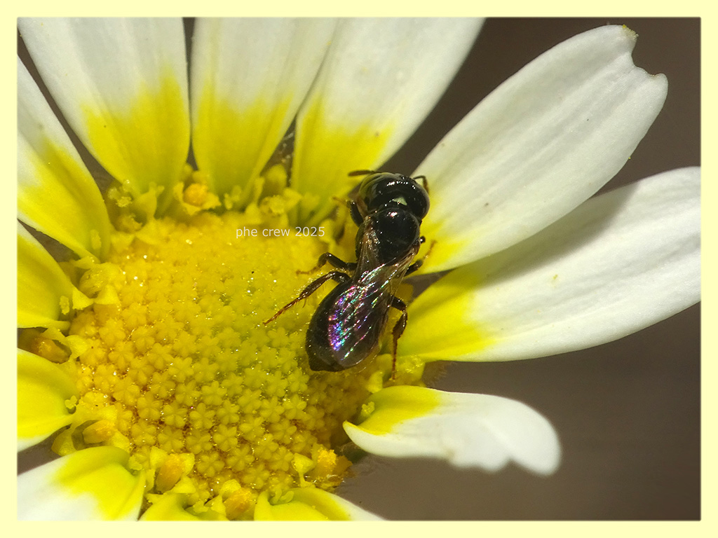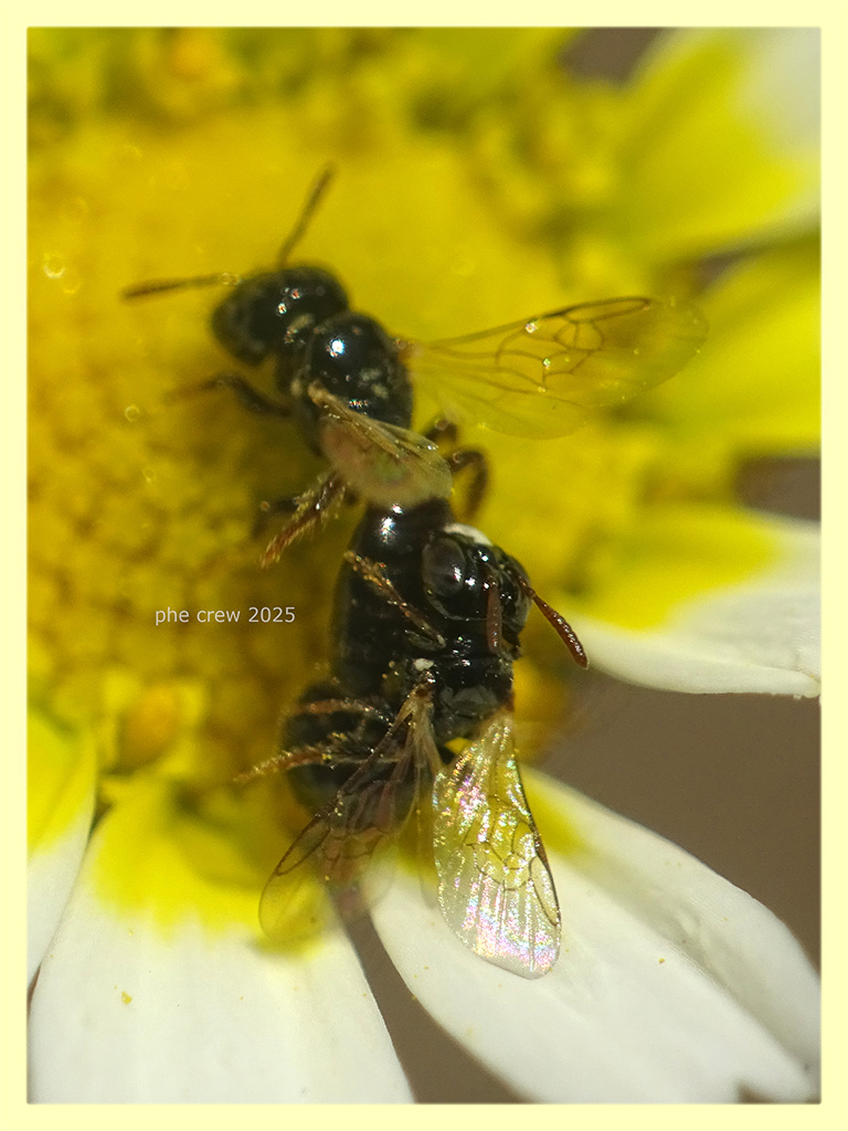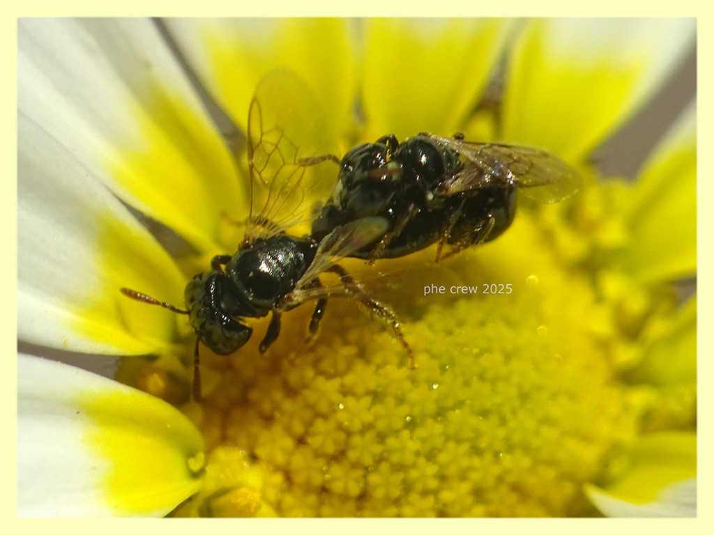 ....questa specie l' ho gia vista sul forum, ma non ricordo il nome. Piu' che altro la ricordo per la sua minuta misura e il corpo liscio e lucente. Stavo fotografando una femmina (prime due foto) mentre suggeva di circa 2,5 mm. quando e' arrivato un maschio di circa 2 mm. con il clipeo bianco e indaffarati nell' accoppiarsi io intanto fotografavo. Si riesce a capire la specie ?