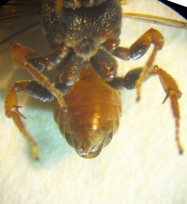Andrea Volpe ha scritto: Ciao Giuseppe, hai controllato che non sia Pasites maculatus? In questo momento stavo guardando due esemplari che ho ricondotto alla specie da me citata e che sembra essere molto simile al tuo esemplare. Tuttavia mi sono appena accorto che i miei esemplari hanno l'ultimo sternite biforcuto e questa, secondo la chiave che sto seguendo, è una caratteristica di Ammobates... Attendo altri pareri insieme a te. Ciao Andrea, grazie per le indicazioni. Quest'esemplare è il primo Ammobatino che raccolgo quindi i caratteri differenziali, anche a livello generico, li controllo per la prima volta. Sicuramente potrebbe essere Pasites maculatus. Non ho controllato l'ultimo sternite (dovrebbe essere il 6°). Il 5° sternite visibile è inciso a semicerchio all'apice e, mi sembra molto caratteristico. Avevo fatto una foto prima di preparare l'esemplare: Giuseppe