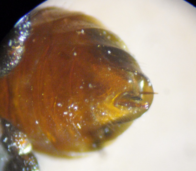 Andrea Volpe ha scritto: Ciao Giuseppe, hai controllato che non sia Pasites maculatus? In questo momento stavo guardando due esemplari che ho ricondotto alla specie da me citata e che sembra essere molto simile al tuo esemplare. Tuttavia mi sono appena accorto che i miei esemplari hanno l'ultimo sternite biforcuto e questa, secondo la chiave che sto seguendo, è una caratteristica di Ammobates... Attendo altri pareri insieme a te. Ciao Andrea, grazie per le indicazioni. Quest'esemplare è il primo Ammobatino che raccolgo quindi i caratteri differenziali, anche a livello generico, li controllo per la prima volta. Sicuramente potrebbe essere Pasites maculatus. Non ho controllato l'ultimo sternite (dovrebbe essere il 6°). Il 5° sternite visibile è inciso a semicerchio all'apice e, mi sembra molto caratteristico. Avevo fatto una foto prima di preparare l'esemplare: Giuseppe