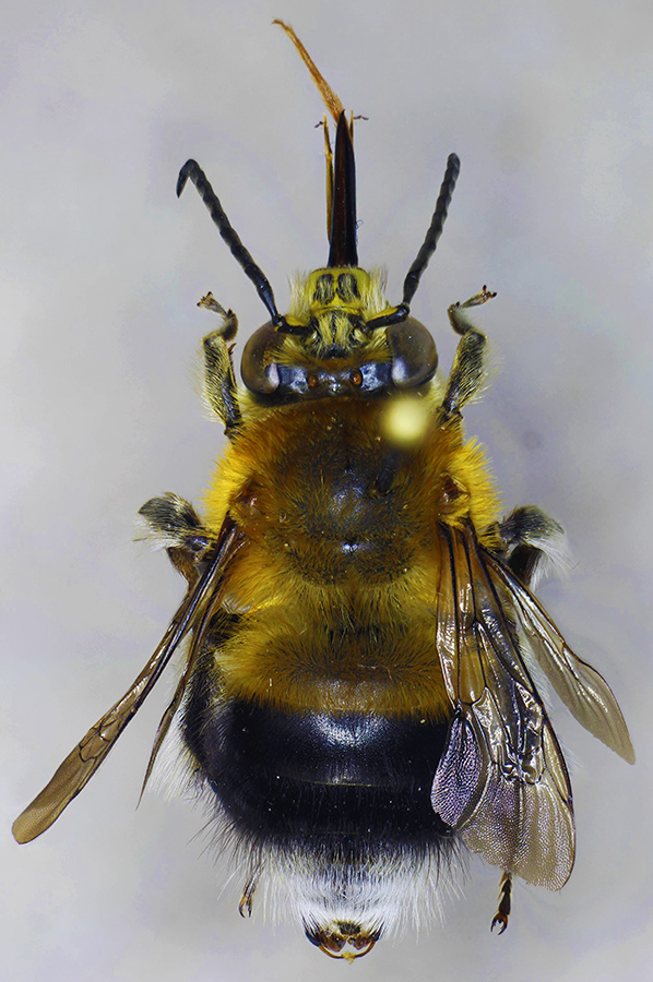 Questo è un maschio, identificabile facilmente per la particolare colorazione e tutta una serie di particolari caratteristiche uniche: le antenne sono allungate e ogni segmento è curvo, i femori sono tutti appiattiti, in particolare quelli posteriori, il basitarso posteriore è fortemente ingrossato e con un dente sul lato ventrale e le coxe anteriori hanno delle lunghe apofisi cilindriche dirette posteriormente e ornate da un denso ciuffo di peli apicale.