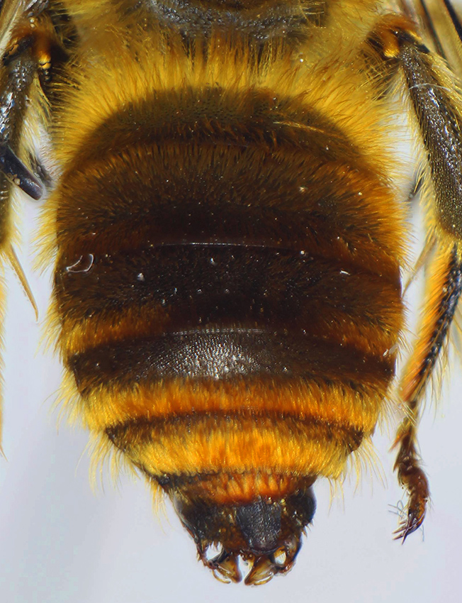 Questa è una bellissima specie di cui ho avuto la fortuna di raccogliere due maschi nella stessa giornata. Si riconosce immediatamente per la peluria rosso-arancione particolarmente accesa, con delle bande più chiare ben evidenti, clipeo e labbro interamente gialli e l'ultimo sternite non solcato nel mezzo, ma interamente concavo con delle carene laterali che vanno a formare dei dentini sul margine. 13mm |