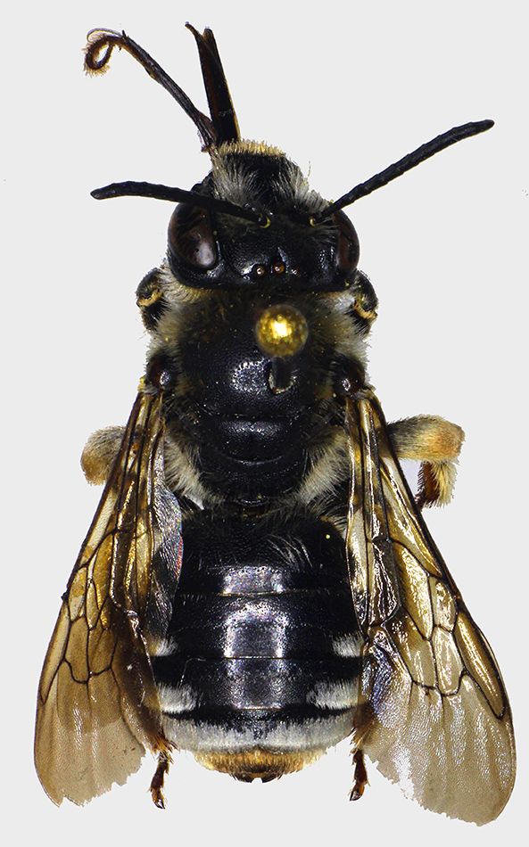 Questa è Eucera proxima, una specie di cui ho raccolto tre o quattro maschi e solo questa femmina. Fa parte del gruppo di specie in cui le femmine hanno solo la banda sul quarto tergite intera, che include ad esempio longicornis e interrupta, ma si riconosce per il mesoscuto lucido tra i punti, i peli dell'addome bianco candido e la punteggiatura dei tergiti molto sparsa, con interspazi maggiori dei punti.